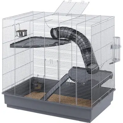 Jenny er et bur for rotter med en vertikal struktur, og gir gnageren din all den plassen han trenger. Takket være de indre plasthyllene, forbundet med rør, vil rotten din kunne kose seg når han kommer inn på alle de forskjellige nivåene i habitatet. Buret er utstyrt med annet tilbehør, som en drikkeflaske, en plaststige og matskåler av stål, som er hygieniske og motstandsdyktige og har festekroker. Basen kan enkelt løsnes fra trådnettstrukturen, noe som muliggjør rask og enkel rengjøring. Et stativ av metall med hjul kan kjøpes og er tilgjengelig som ekstrautstyr.
