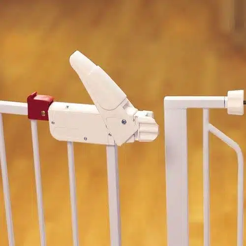Takket være den praktiske gjennomgangskonstruksjonen trenger du ikke ta ned grinden for å komme forbi. Den har et brukervennlig håndtak som frigjøres med ett enkelt trykk – enkelt for deg, men trygt nok til å holde hundene på plass.